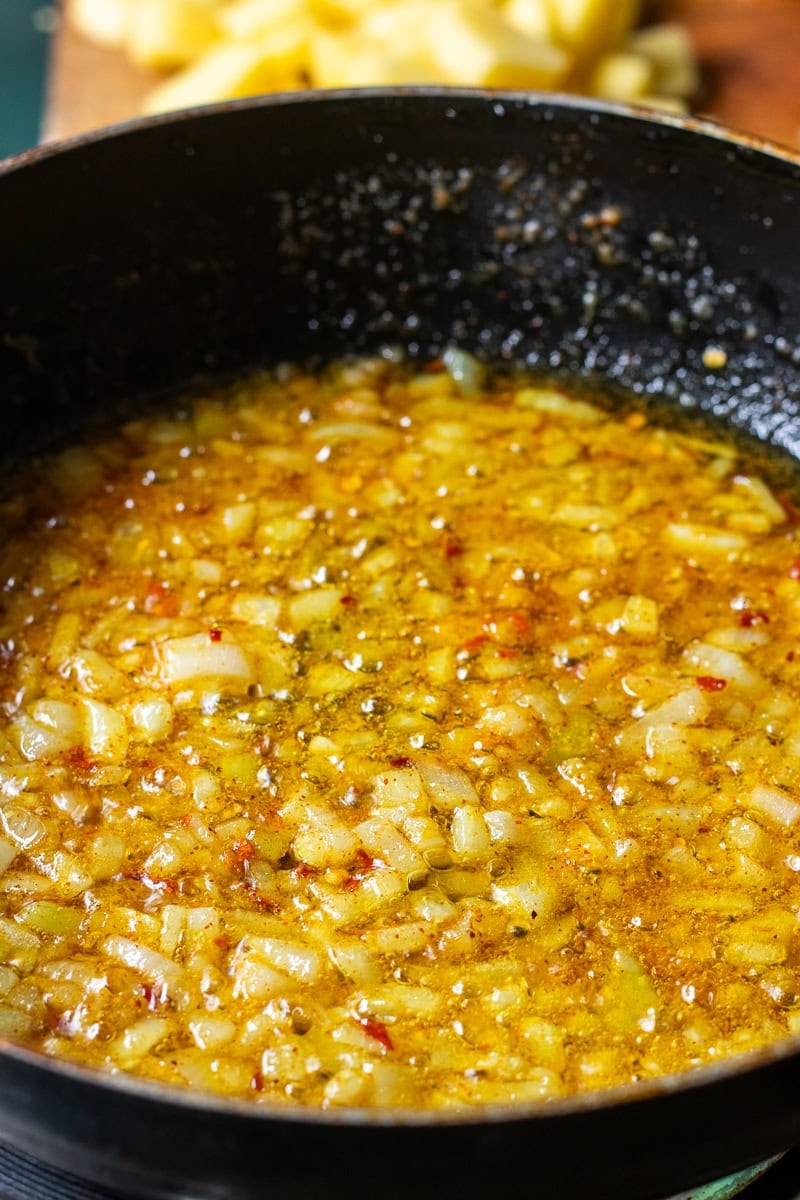 - Add the ginger/garlic and sauté for a minute, then add the spices and sauté for another minute.