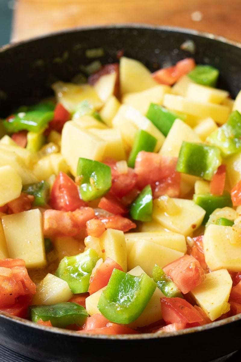 Now simply add your tomato, potatoes, and peppers to the pot. If you want tender crisp peppers then wait till the potatoes are halfway cooked. Cover and cook on low heat with half a cup of water, until cooked through.