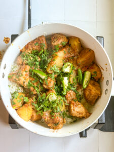 - Add your potatoes, aloo bukharay (if using), half a cup of water, cover the pot, and bring it to a simmer, cooking for 25 minutes or so or until the chicken is tender. Check on it halfway through to see if the masala is sticking (add more water if it is), but otherwise there's no need to disturb it.