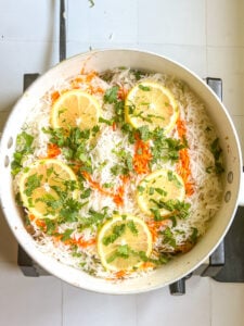 - Top with a few drops of kewra or biryani essence, drizzle over your rice coloring, and add a few slices of lemon and/or tomatoes, extra cilantro over top and cover with a tightly fitting lid. If your lid has a steam vent then please block it.
