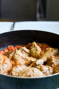 - When the chicken is tender, turn up the heat to dry out any excess water, turn the stove off as soon as it starts to stick a little and the oil is above the masala. I like to add half my green masala from the layering (mint, cilantro, chilies) now along with a squeeze of lemon juice.