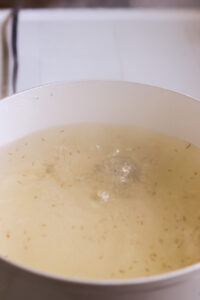 Halfway through bring a pot of water to boil and add in your salt, vinegar and rice spices however you choose to add them (loose, tea ball, or muslin cloth).