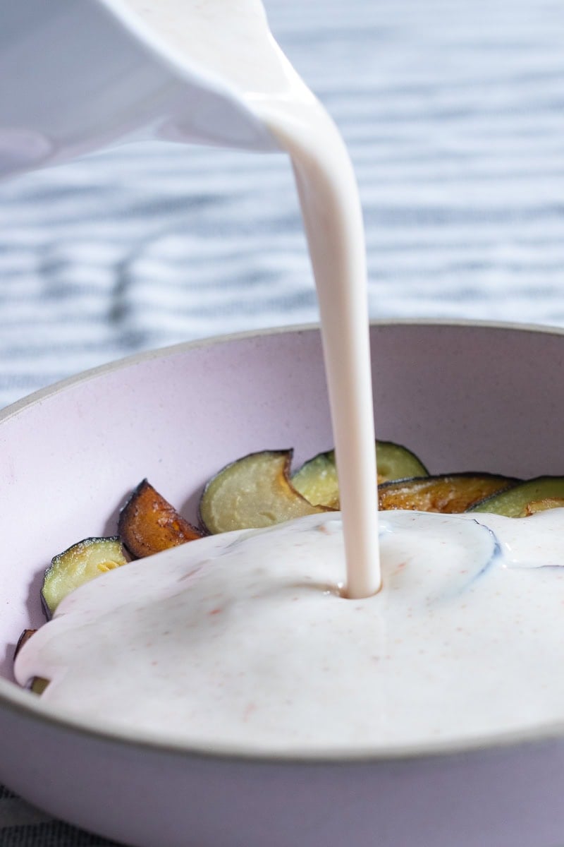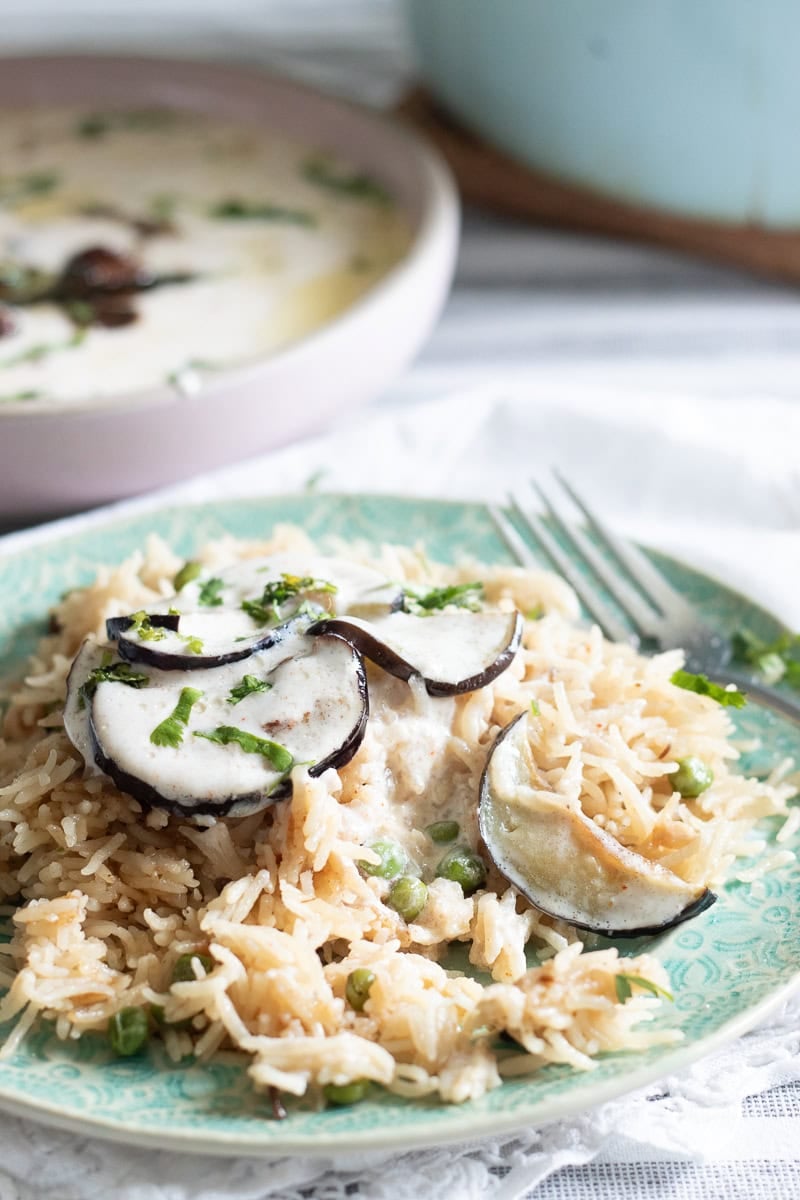 This Dahi Baingan or Baingan ka Raita is a simple delicious dish where lightly spiced eggplants are layered with zingy yoghurt and topped with a baghaar/tadka. It is perfect as a side to your favorite dishes and good enough to eat with some roti!