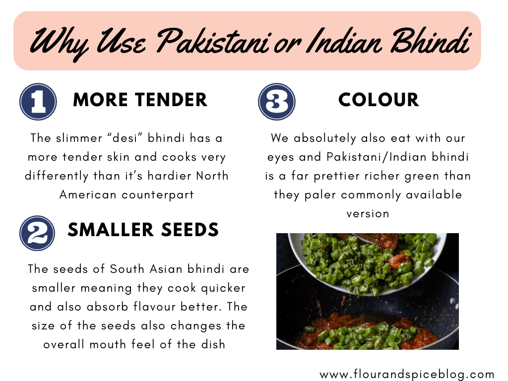 There are two varieties of bhindi and they cook fairly differently. When possible please try to get Indian or Pakistani bhindi!