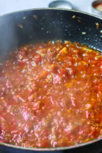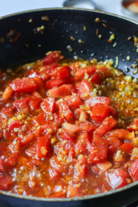 - Now stir in your tomatoes, salt, chili powder + flakes, coriander powder, and turmeric.