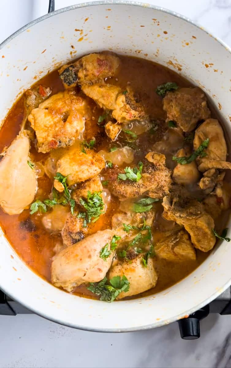 - Now add ½ cup of water to your pot if the masala seems very bring to a boil and simmer on low until the chicken is cooked through, 15-20 minutes.