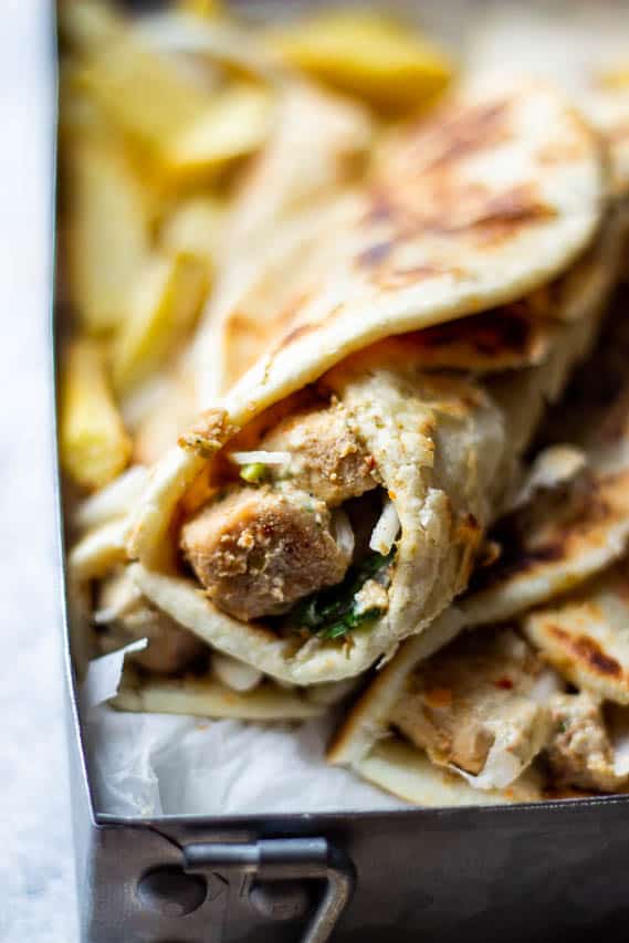 - Place your paratha on a clean surface, create a line of chicken pieces, layer on the onion mix, and then the chutney. Roll up the paratha and wrap in foil/paper and serve with extra chutney on the side. Fries and Garlic Mayo (recipe in post) are always welcome!