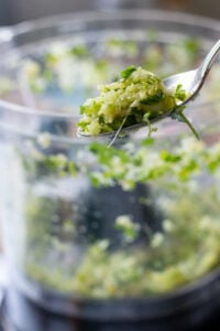 Simply put your onion, ginger, garlic, cilantro, and green chilies into the food processor, give it a quick whir for a rough chop. Then add your remaining ingredients and blitz till it comes together. This happens VERY quickly, you don't want to overdo it!
