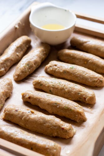 - Grease your hands and shape into kababs either on skewers or without. I make mine 5-6 inches long.