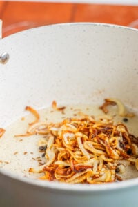 - Now add in the minced ginger and continue to cook allowing the ginger to develop golden edges and the onions to darken.