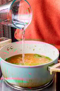 - Use the same measuring cup you used for rice and add 2.5 cups water (½ cup went in with the chickpeas). I always taste the "broth" here to make sure it's flavorful.