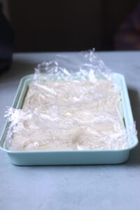 - Tip: If using a loaf tin or if you want to serve it pre sliced then lining the dish with plastic wrap makes for easier removal.
