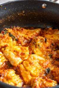 - Add your kasuri methi, half your chilies and cilantro, and cover and let the fish cook for 3-4 minutes.
