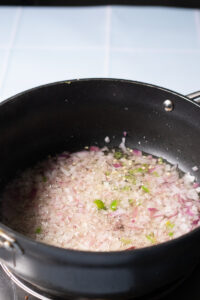 - Heat oil in a saucepan or pot and add your onions and minced green chili