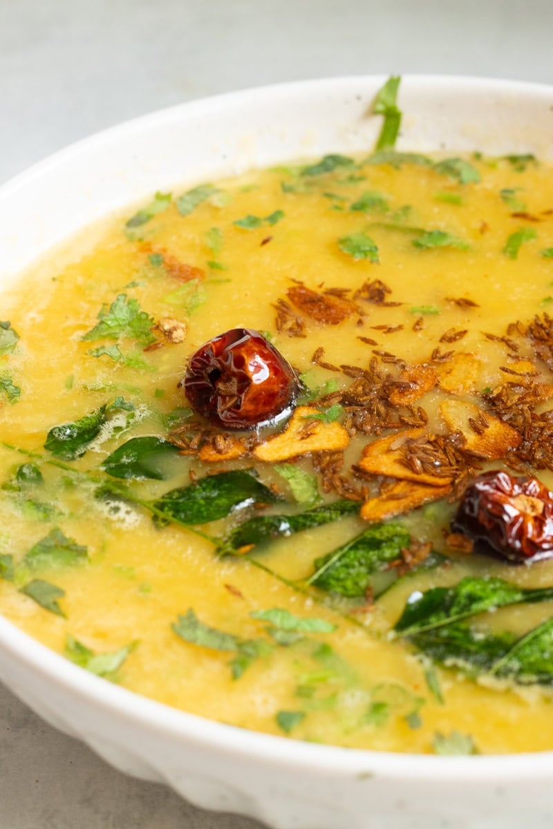 While the tomato forward version of this daal is characterized by an over the top tanginess which is a result of the double whammy of tomato paste and lemon, the tomato-less version reads more like a clean mellow flavorful comfort akin to that of moong ki daal.