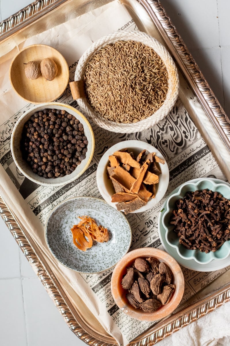 - Put a pan on medium high heat and dry roast the peppercorns, cloves, black cardamom, and cinnamon bark until fragrant and toasty. This takes about 2-3 minutes.