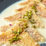 Shahi Tukray (shahi=royal, tukray=pieces) or Shahi Tukda is a rather fancy name for a dessert that is fried bread soaked in flavored milk. There are many versions of it. Popular iterations include