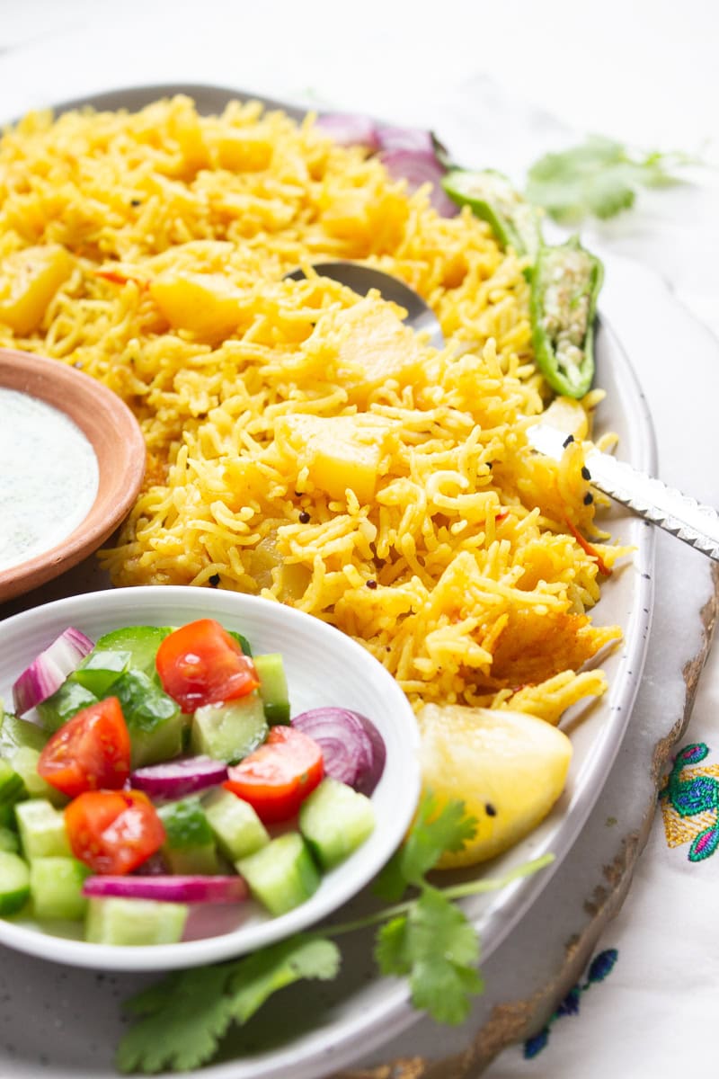 My favourite way to eat this Tehri recipe is with some green chutney style raita and some kachumbar. Kachumbar for those of you who don't know is a simple salad with chopped onions, tomatoes, cucumbers, cilantro, chilies and lemon juice. The fresh acidity of the kachumbar with the tangy raita and the flavorful Tehri is a big ol flavour party I always want to be invited to.